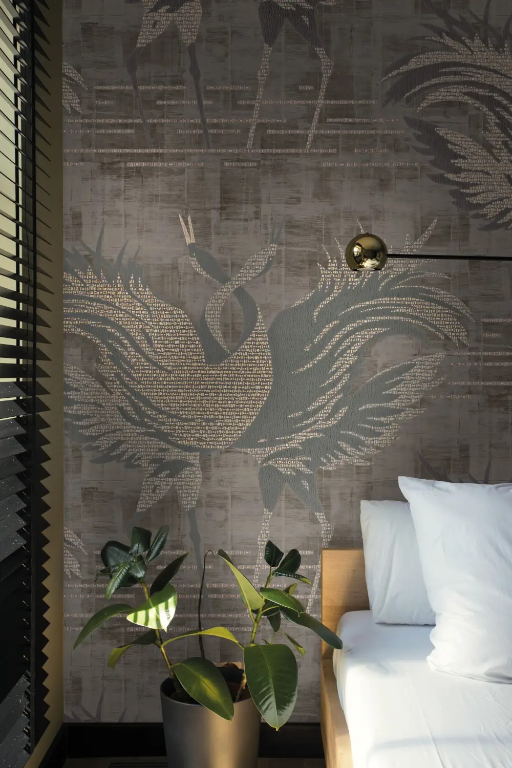 На обоях изображены две изящно переплетающиеся цапли на мерцающем металлическом фоне. Узор сочетает в себе элегантную японскую эстетику с естественностью и добавляет особый акцент в комнату благодаря блестящим рельефным бусинам золотого или серебряного цвета. Роскошная поверхность в сочетании с азиатским дизайном создает гармоничный эффект на стене с оттенком экзотики.