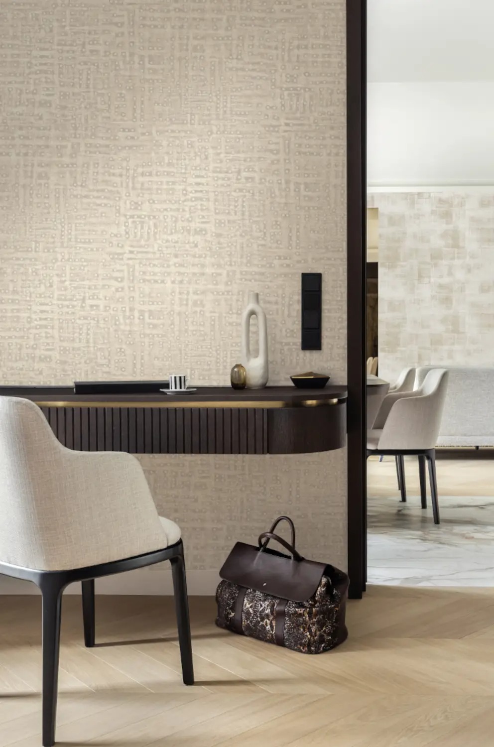 Обои украшены декоративным узором, создающим теплую и изысканную атмосферу. Контраст между металлическим или матовым фоном, в зависимости от цветовой гаммы, и блестящими, выпуклыми элементами создает впечатление капель краски, сошедших с кисти художника. Изделие изготовлено на высококачественной нетканой основе. Это значительно упрощает его монтаж: на стену наносится клей, и панели приклеиваются непосредственно к стене.