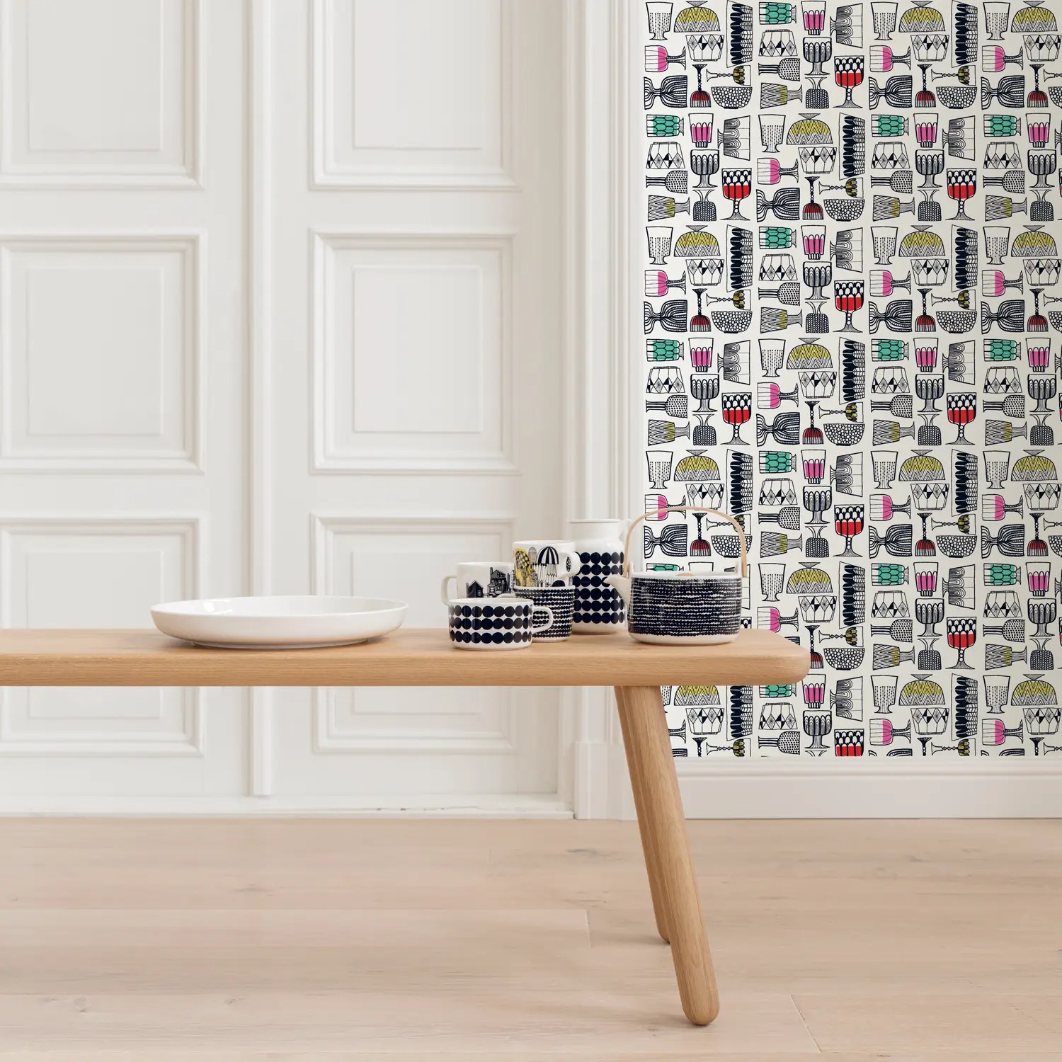 На обоях изображены стаканы и кружки, и они выполнены в графическом стиле. Дизайн соответствует скандинавскому стилю оформления стен.