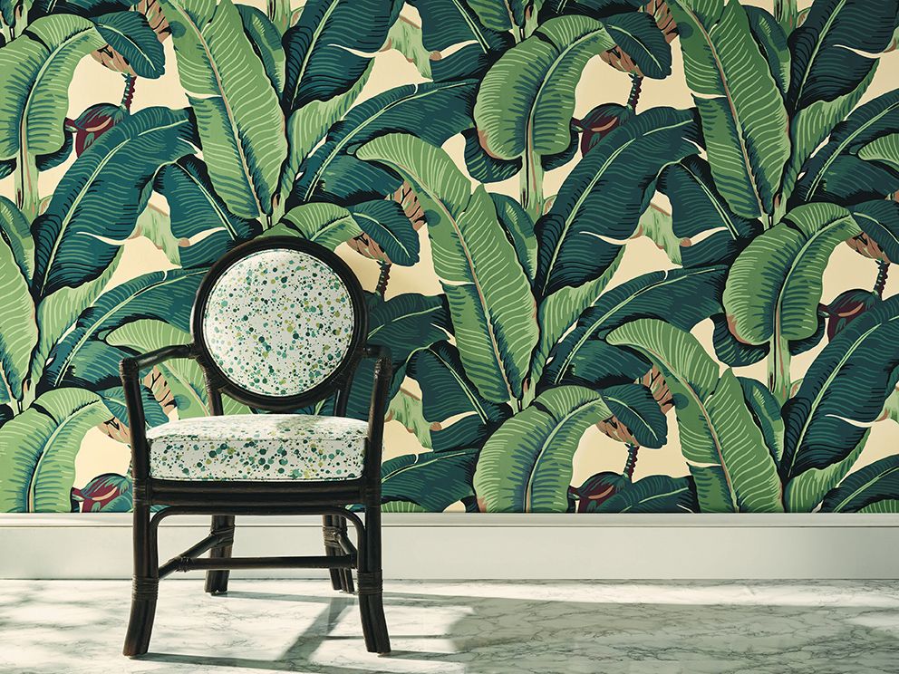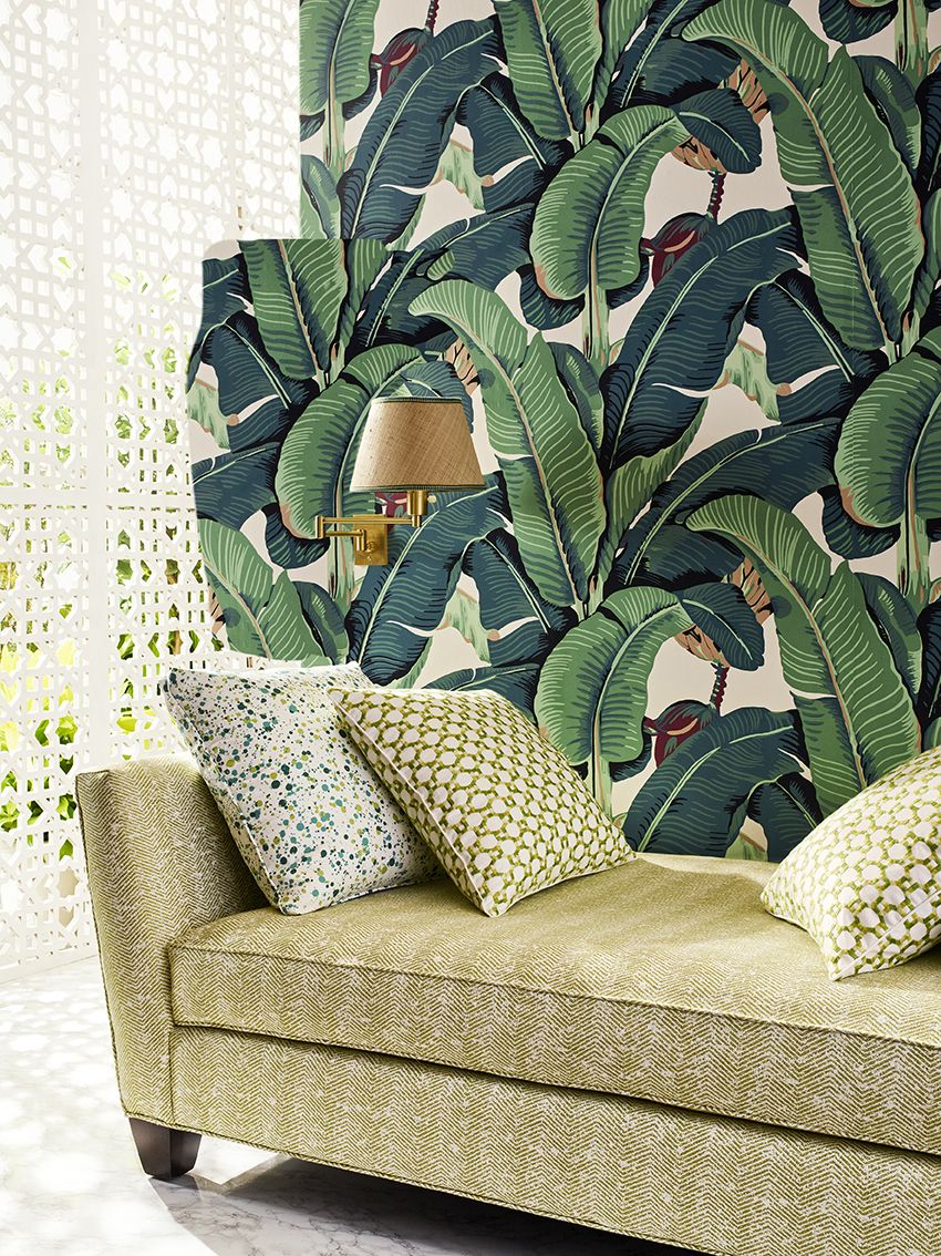 Дизайн HINSON PALM. Насыщенные цвета, смелые узоры и энергия в изобилии присутствуют в цветовой палитре Hinson Palm. Один из самых востребованных дизайнов в мире, он отличается крупным мотивом из банановых листьев, которые создают энергичную и доминирующую тропическую атмосферу. Этот дизайн обоев вдохновлён природными формами и текстурами, что делает его превосходным выбором для создания уютной и расслабляющей обстановки в любом помещении.