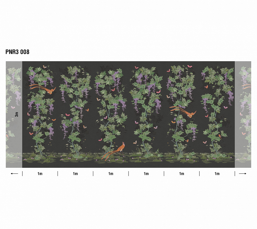 Панно «Шинуазри: райский сад» PNR3. Архивный дизайн с чудесным садом в китайском стиле, трепетно восстановленный и переработанный из образца старинной вышивки на шелке эпохи династии Цин. В восточной культуре глицинии имеют особое значение: о них рассказывает прекрасная легенда про девушку неземной красоты, чьи длинные волосы отливали в лунном свете синим и лиловым, и в честь нее были названы эти волшебные цветы, струящиеся на ветру.