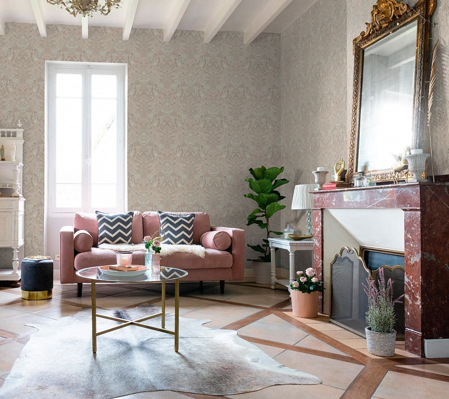 Этот сложный восточный орнамент украшал не только стены, но также и обивку мягкой мебели. Эти обои представляют фактурный, «текстильный» дамаск в его традиционном исполнении, как в интерьерах императорских дворцов и дворянских усадеб