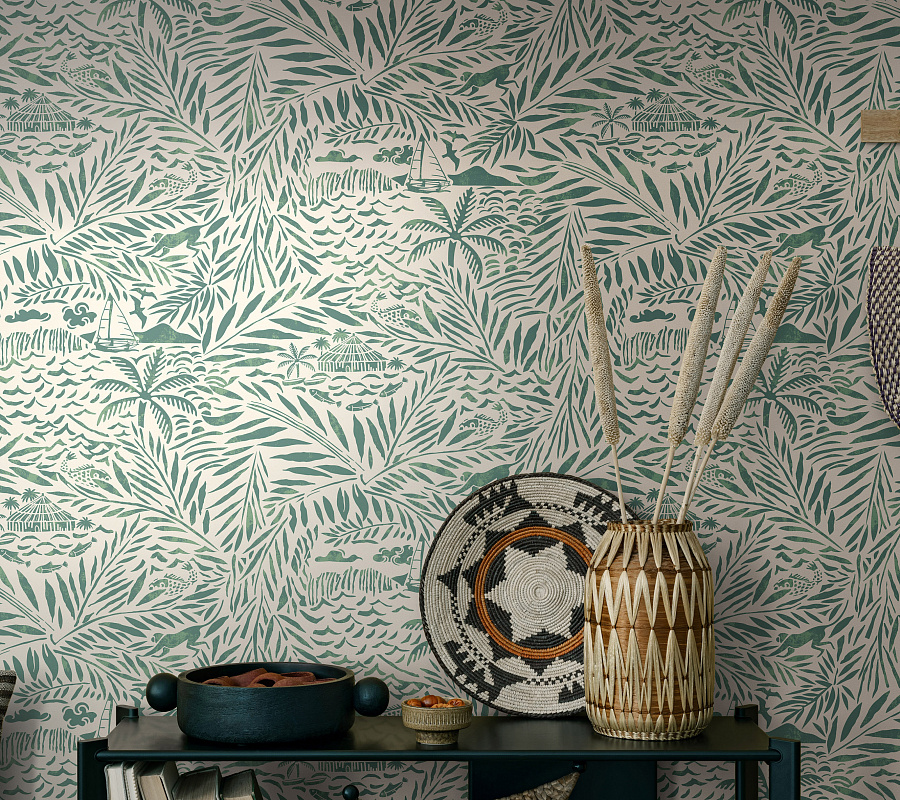 Обои «Мальдивы» CRZ6. Этот дизайн — яркое воплощение беззаботной легкости пляжного отдыха на райских островах с чистейшей бирюзовой водой и белоснежным песком. Раскидистые листья пальм, забавные обезьянки, игривые стайки маленьких рыбок, уютные бунгало с соломенной крышей и покачивающиеся на волнах парусники — так выглядит долгожданный отпуск на сказочных Мальдивах.