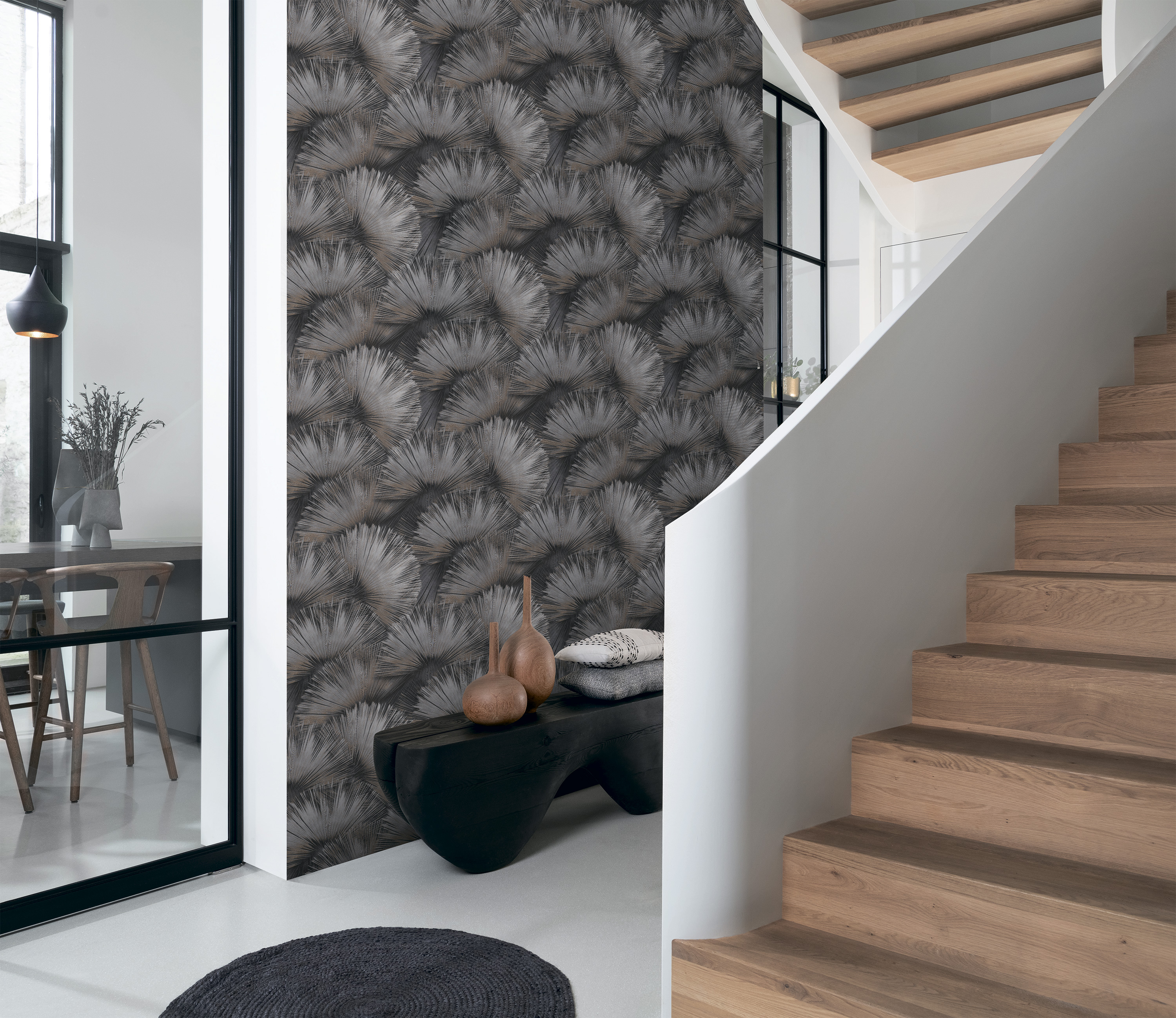 Графичные веера — декоративный взрыв на стене. Глубокие тона графита, таупа и розово-бронзового с металлизированными акцентами создают современное и благородное звучание, подходящее для гостиных и столовых.