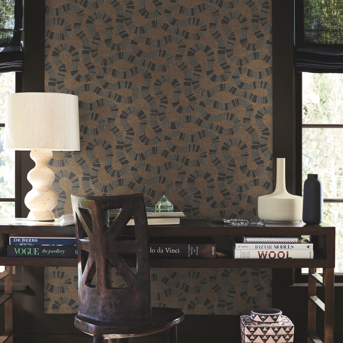 Извилистые формы многослойного узора Ophidia подчеркиваются богатым текстурным фоном и природными оттенками.