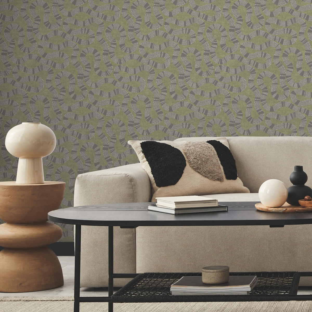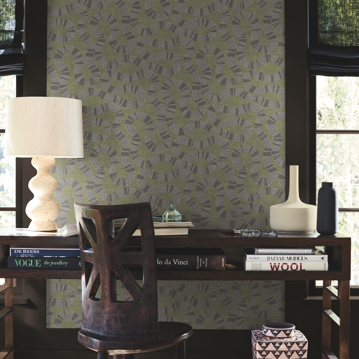 Извилистые формы многослойного узора Ophidia подчеркиваются богатым текстурным фоном и природными оттенками.