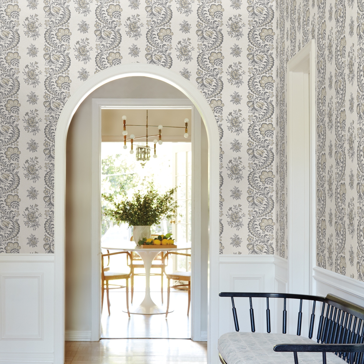 Колонны вьющихся цветочных лоз чередуются с изящными цветочными композициям. Дизайн выполнен с технике печати Surface print.