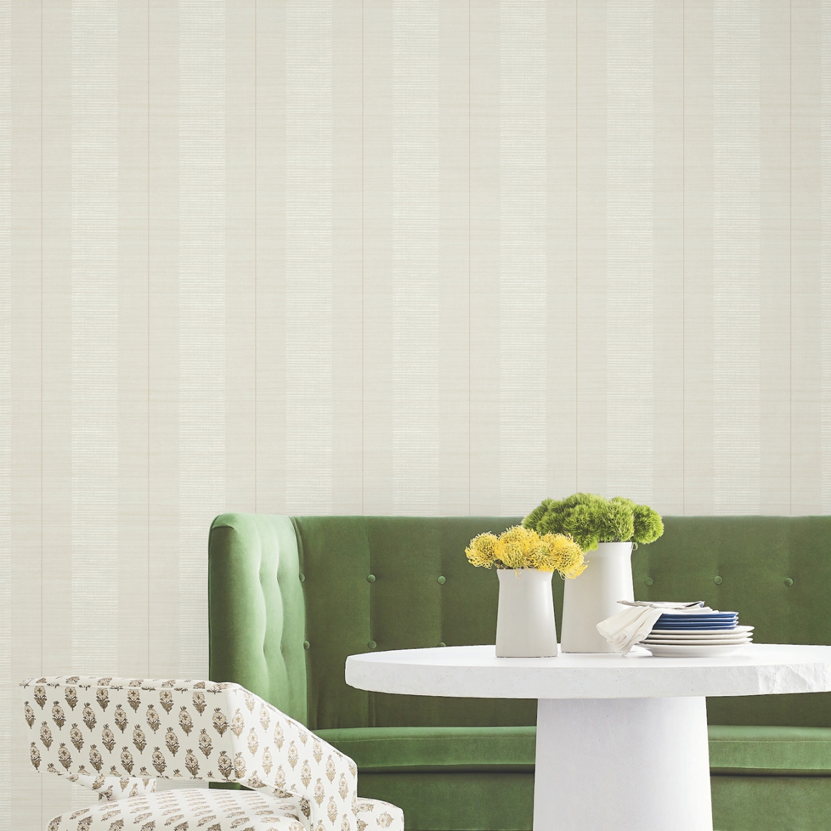 Многослойная изысканность Colbert Stripe создается за счет сочетания текстурных колонн, позолоченных узких полосок и горизонтального фона.