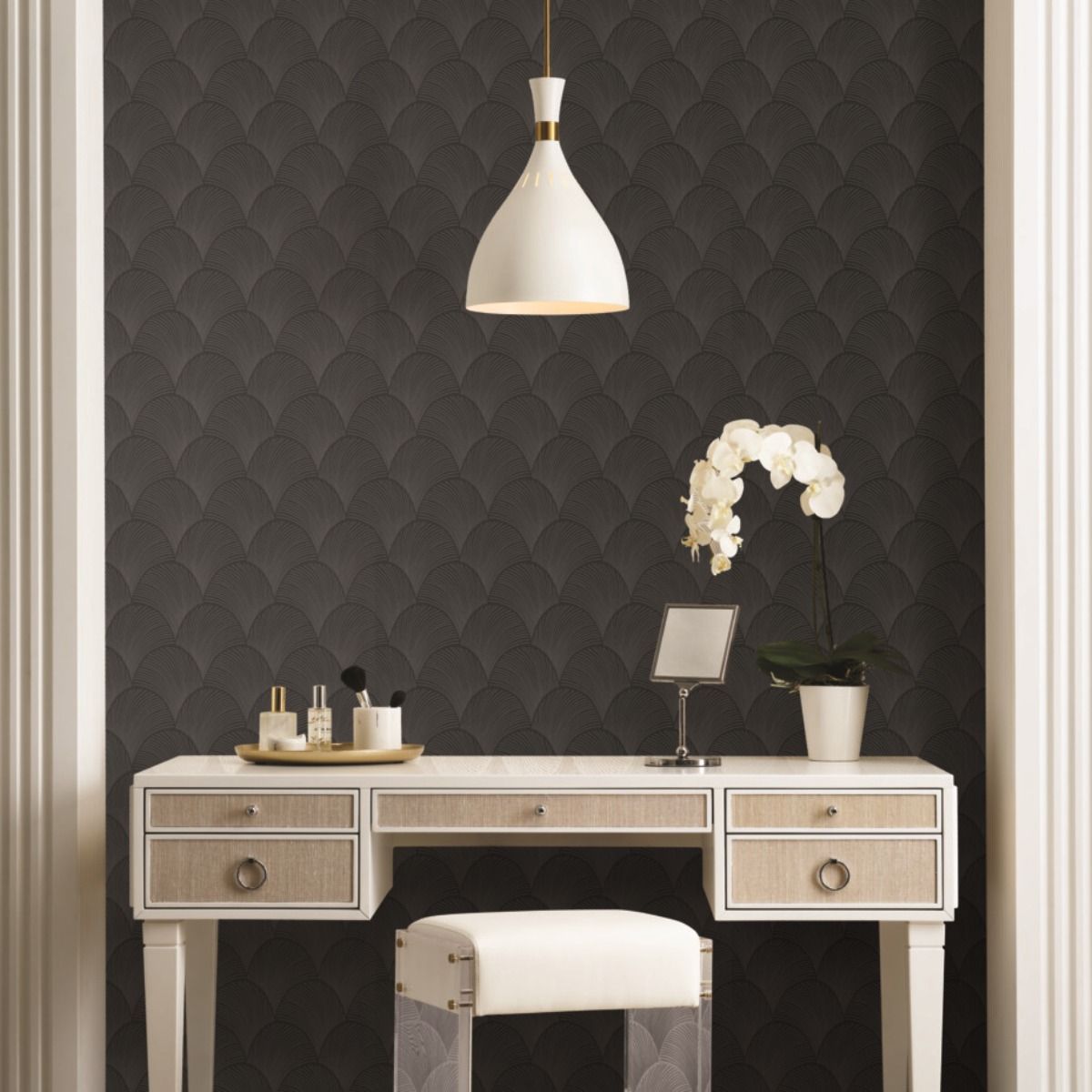 Утонченные перекрывающиеся веера узора Metallic Scallop создают плотный рисунок из тонких металлизированных линий.