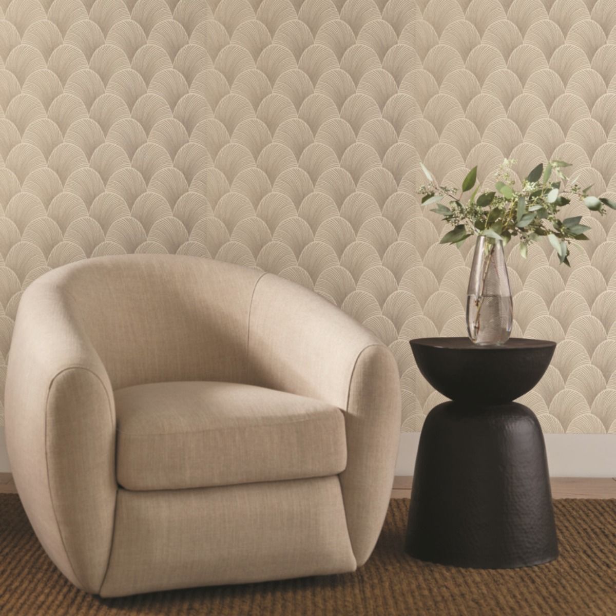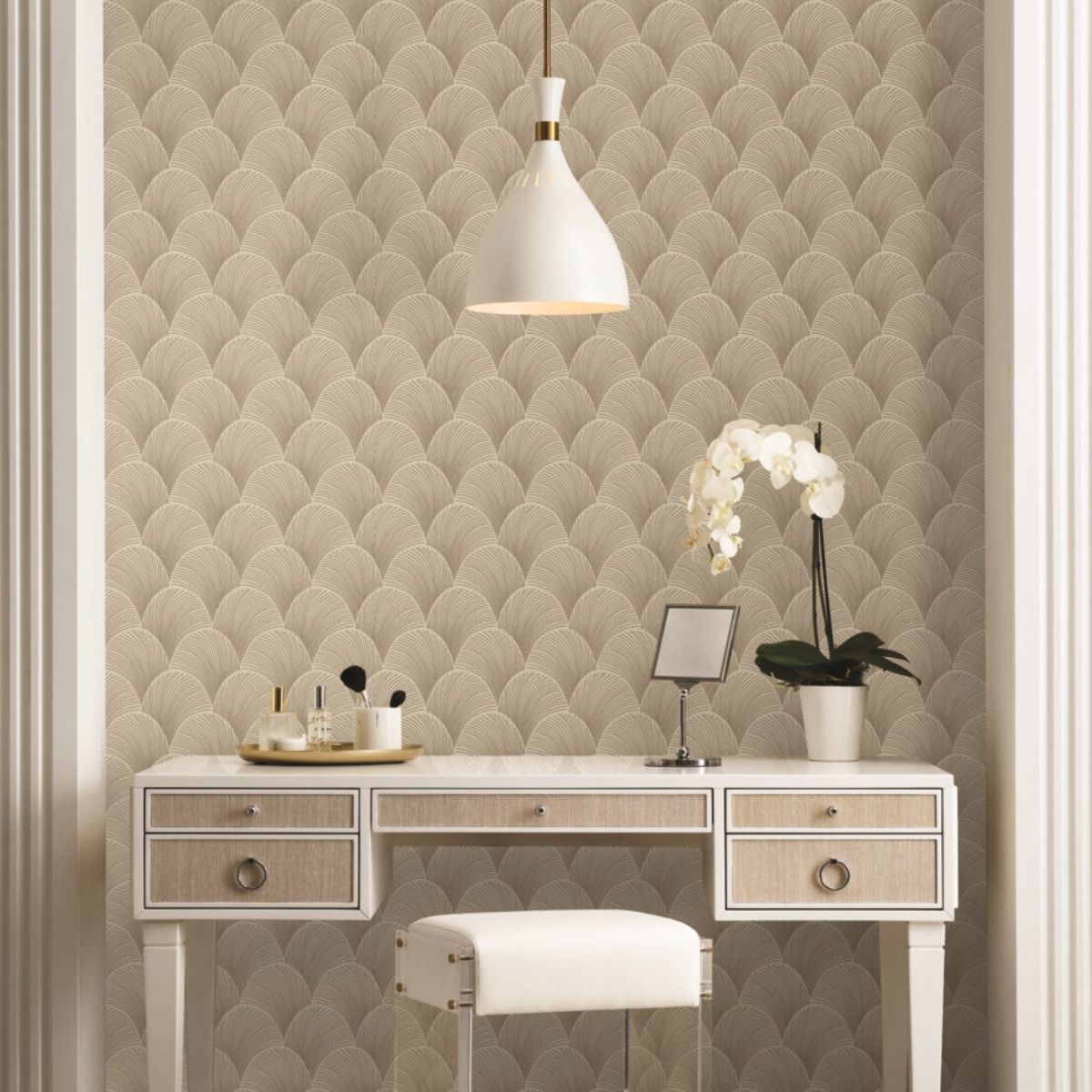 Утонченные перекрывающиеся веера узора Metallic Scallop создают плотный рисунок из тонких металлизированных линий.