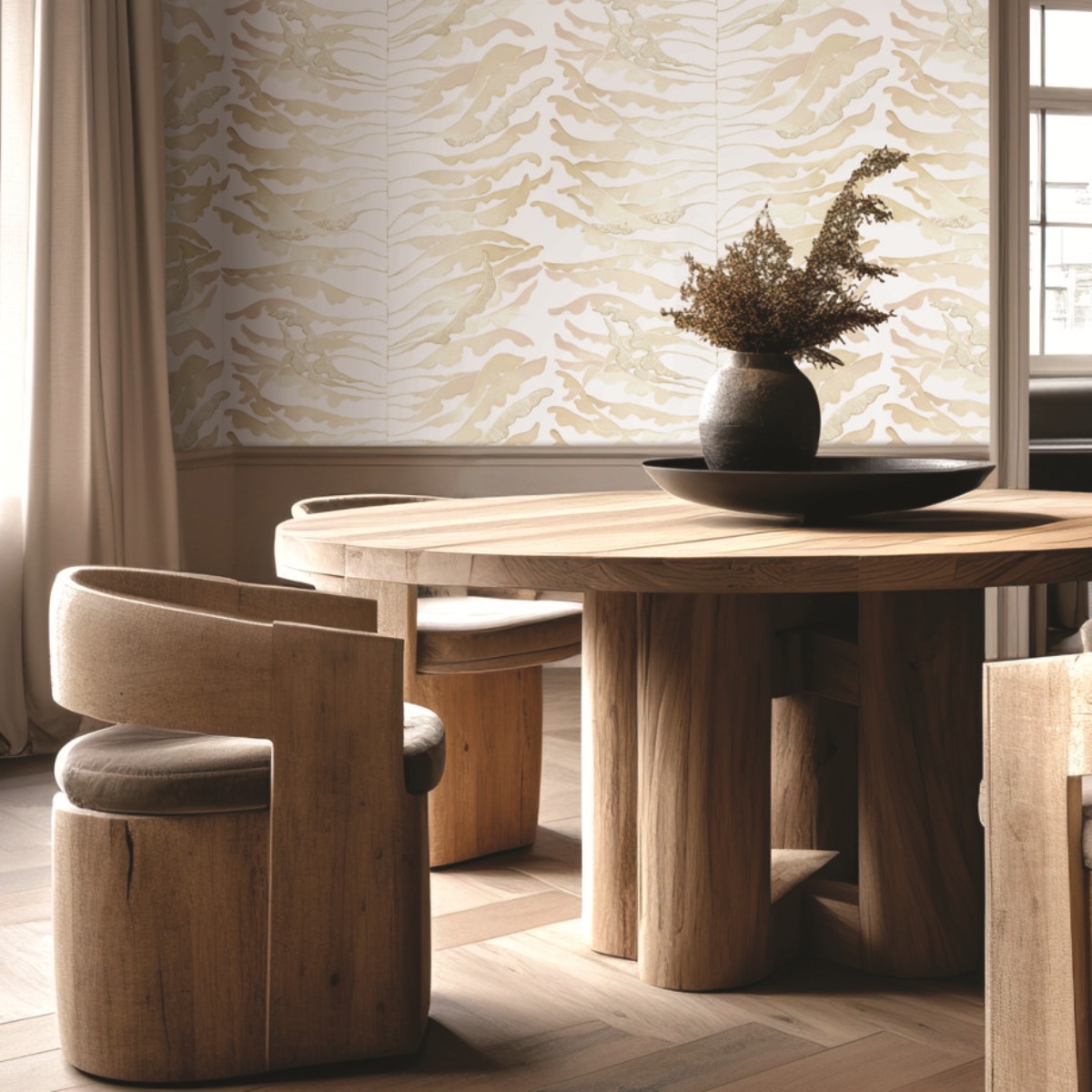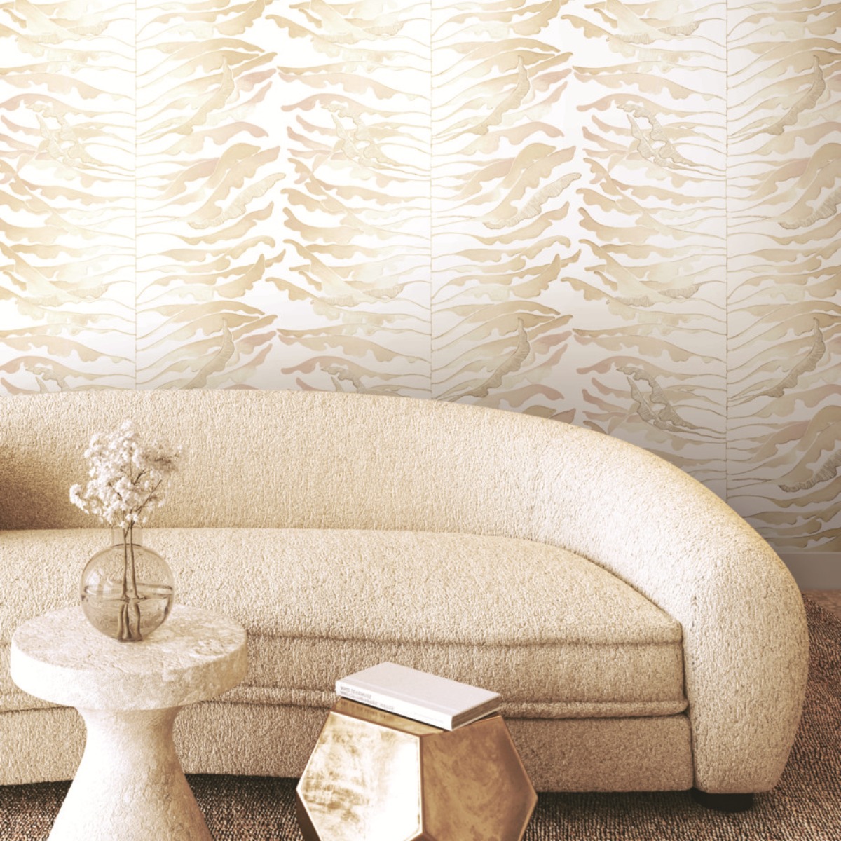 Яркий дизайн Leaf Column развивает тему полосок через растительные образы. Тонкие вьющиеся листья вдоль центрального стебля украшены металлизированными эффектами.