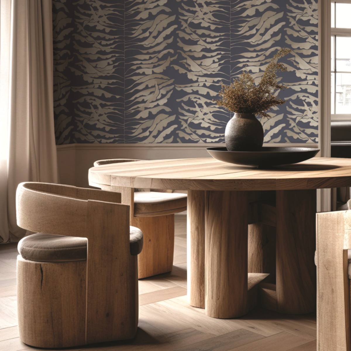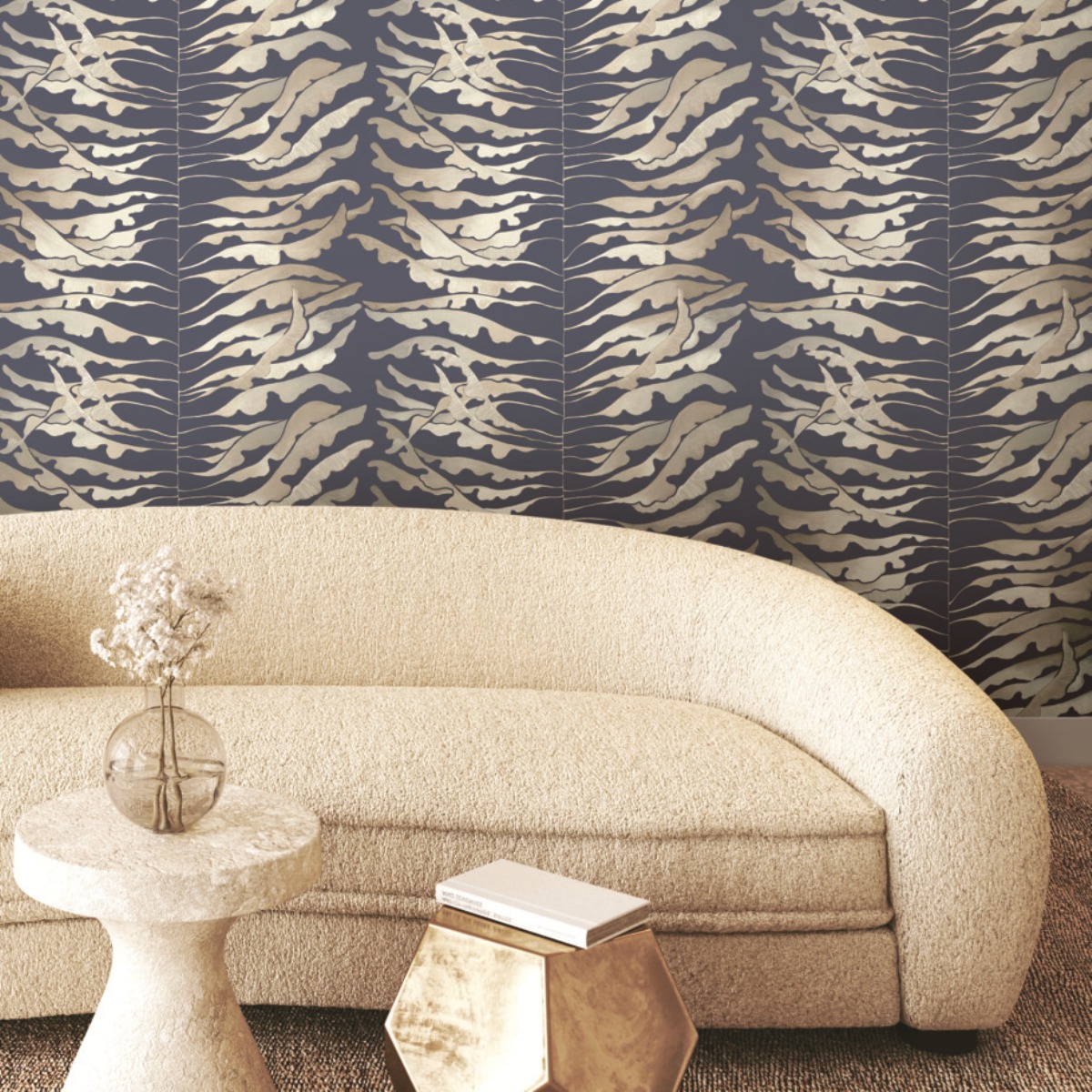 Яркий дизайн Leaf Column развивает тему полосок через растительные образы. Тонкие вьющиеся листья вдоль центрального стебля украшены металлизированными эффектами.