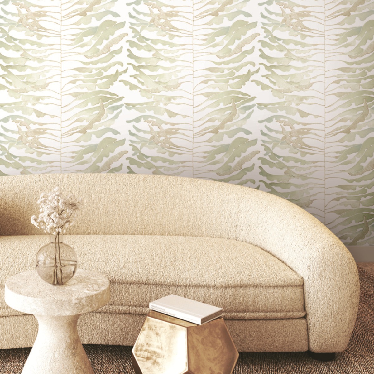 Яркий дизайн Leaf Column развивает тему полосок через растительные образы. Тонкие вьющиеся листья вдоль центрального стебля украшены металлизированными эффектами.
