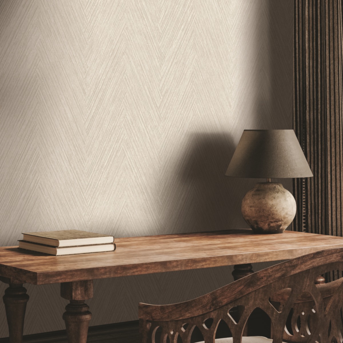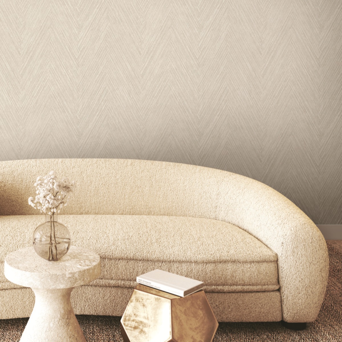 Имитация соломенного плетения в Thatched Chevron придает дополнительное украшение классическому узору с мягкими металлизированными бликами.