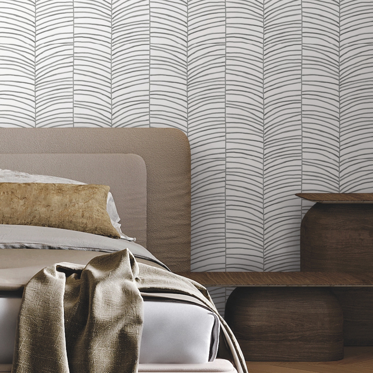 Вневременной узор шеврон воплощен в тропическом рисунке пальмовых листьев Cascade Palm Chevron.