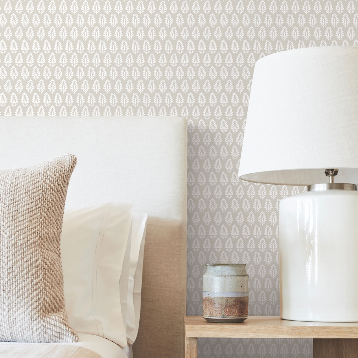 Изящный веерообразный растительный мотив создает монохромный рисунок в технике печати Surface Print.