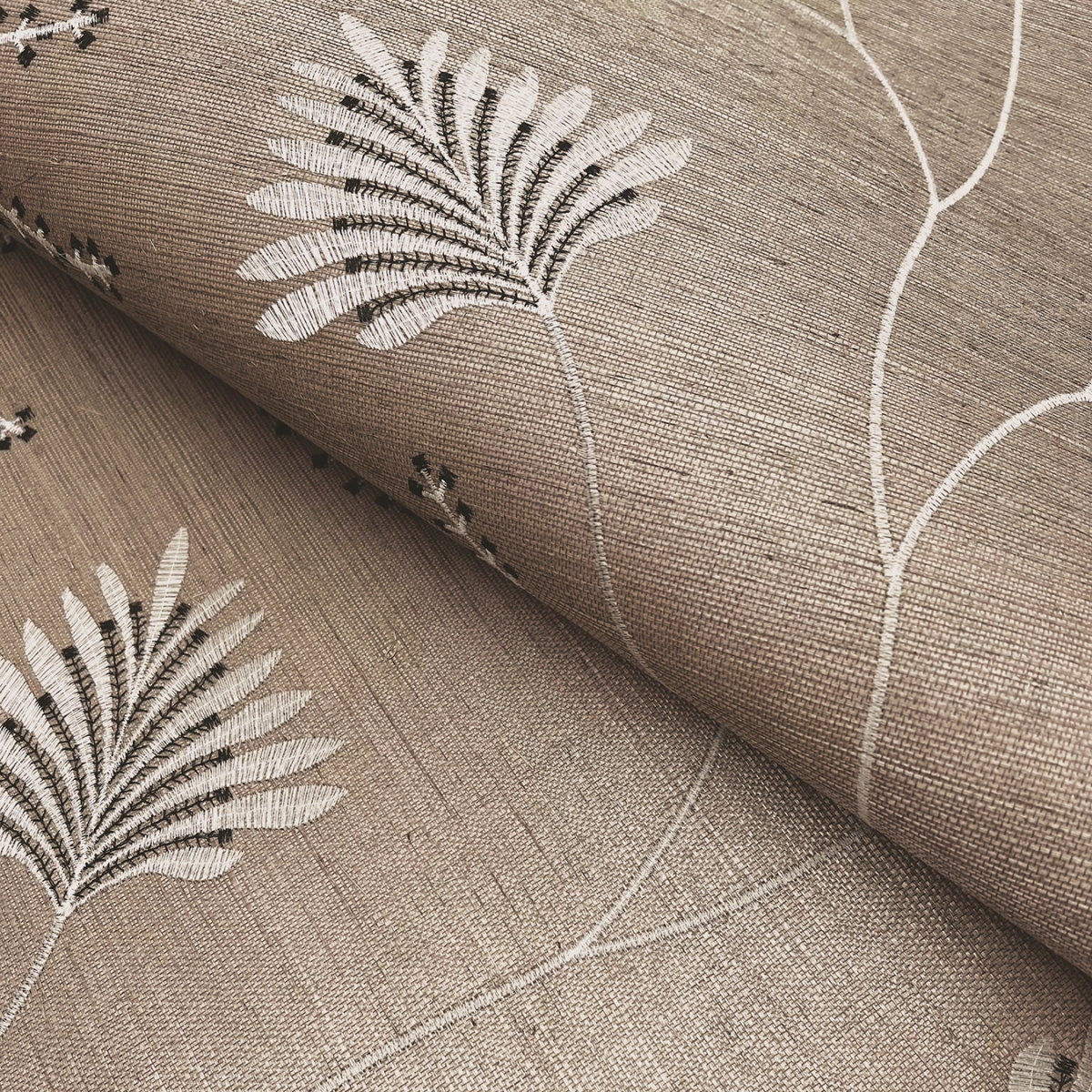 Роскошный узор Laelynn украшен цветами, вышитыми на сизале металлизированными нитями.