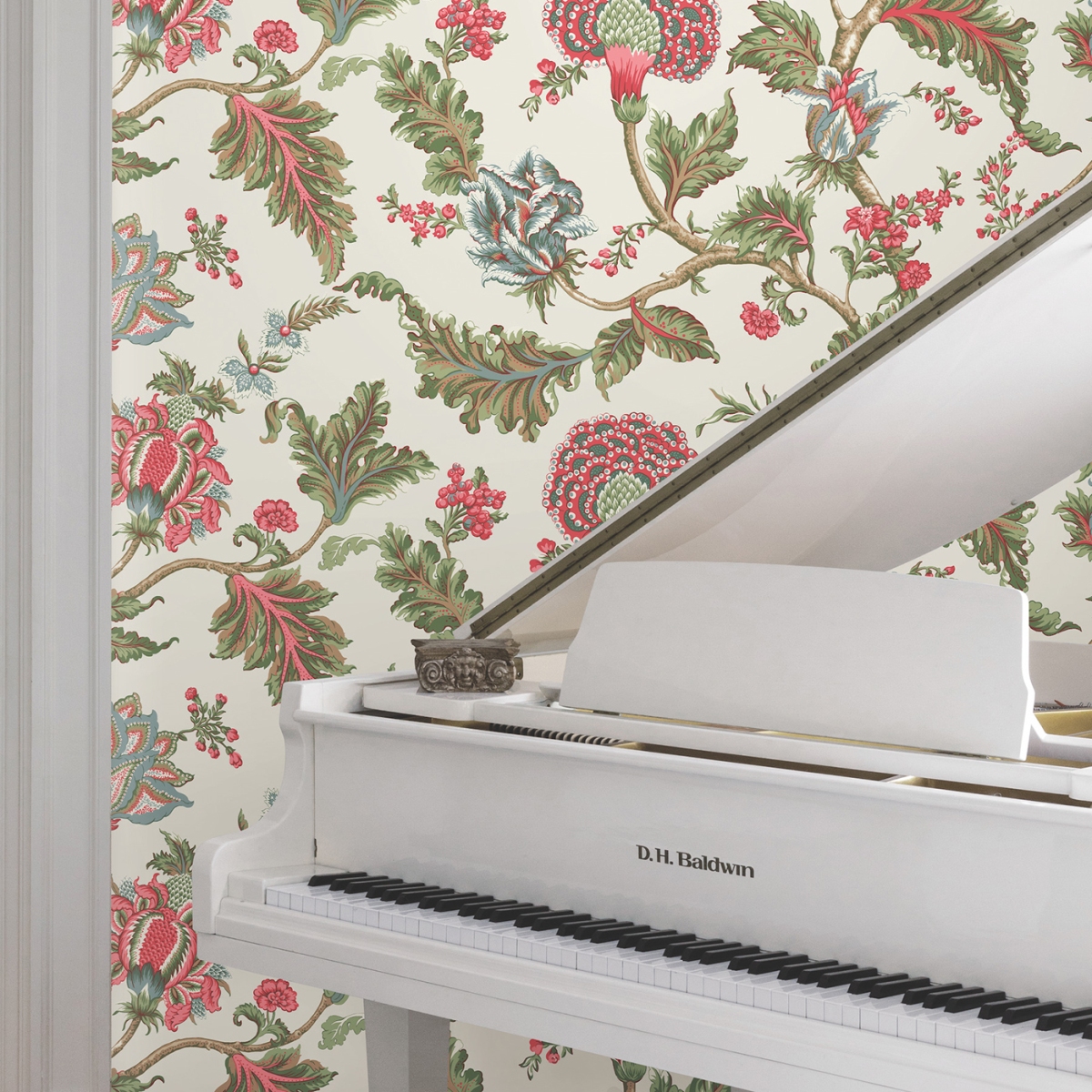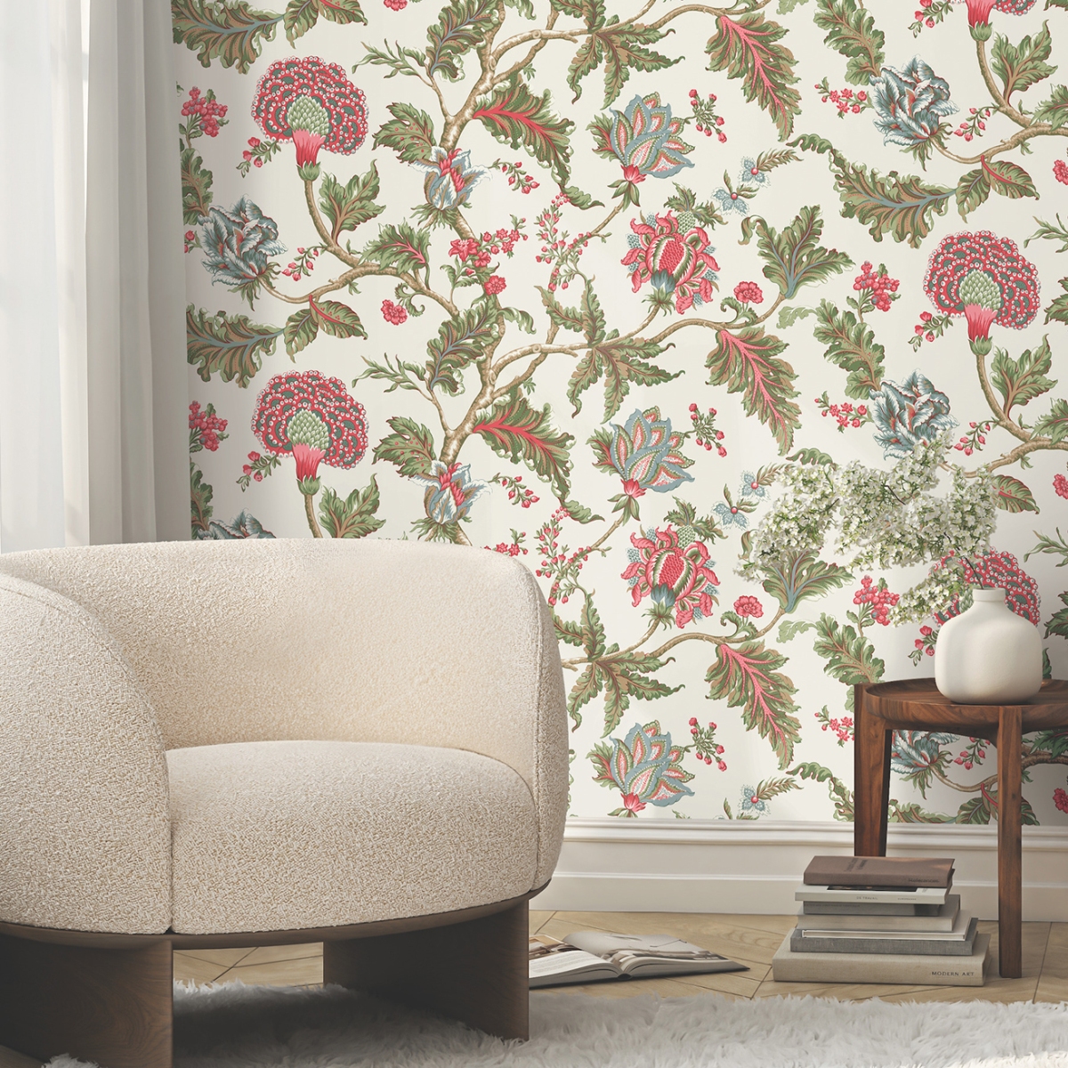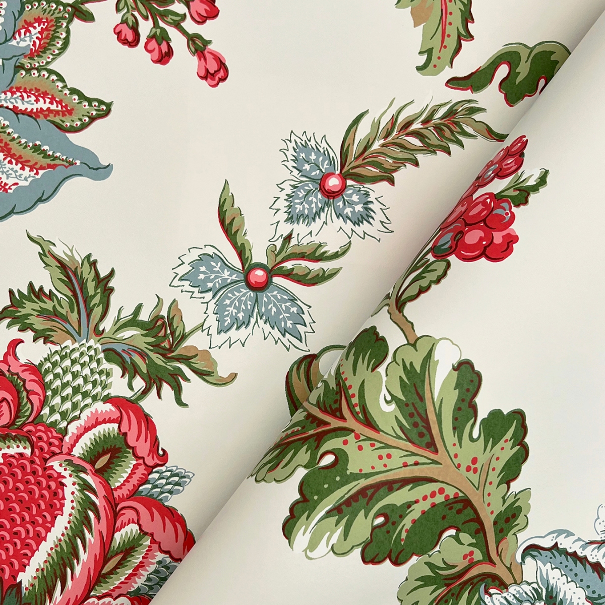 Роскошные листья и пышные многослойные цветы украшают извилистые ветви в масштабном дизайне в стиле эпохи короля Якова.