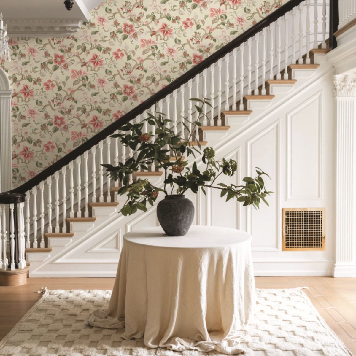 Стилизованные распустившиеся цветы и листья обвиваются на извилистой ветви в современном якобинском принте.