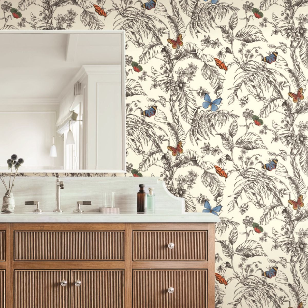 Ярко раскрашенные бабочки порхают на фоне изящных монохромных образов тропической флоры в узоре Papillon, усиливая объемное восприятие рисунка.