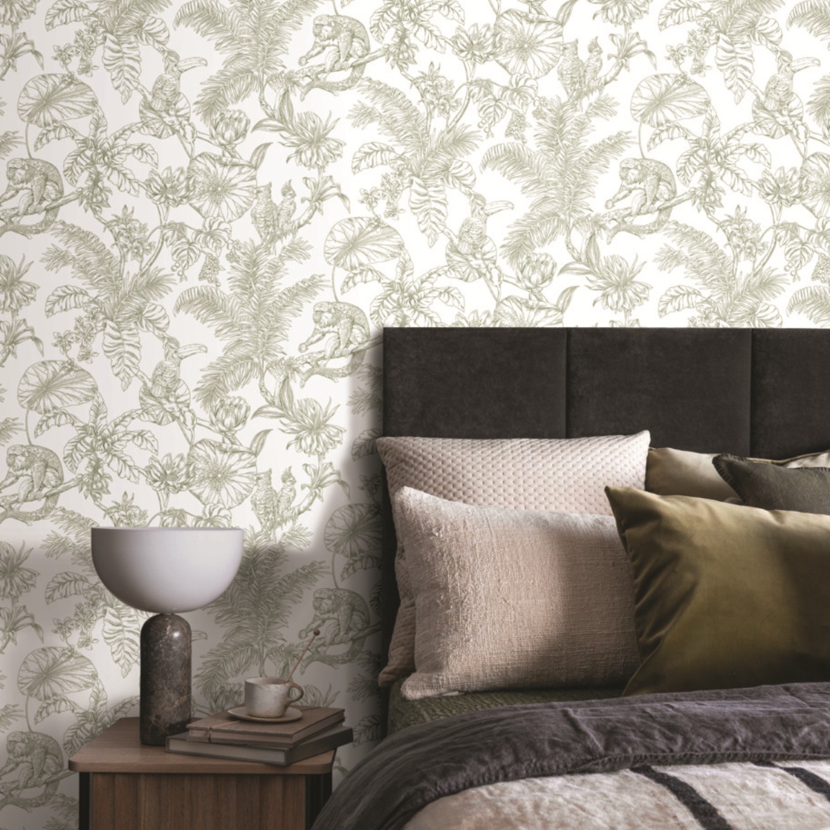 Необычная иллюстрация исторического мотива через новые образы, дизайн Tropical Sketch Toile демонстрирует воздушные образы тропического леса и его обитателей в современном исполнении.
